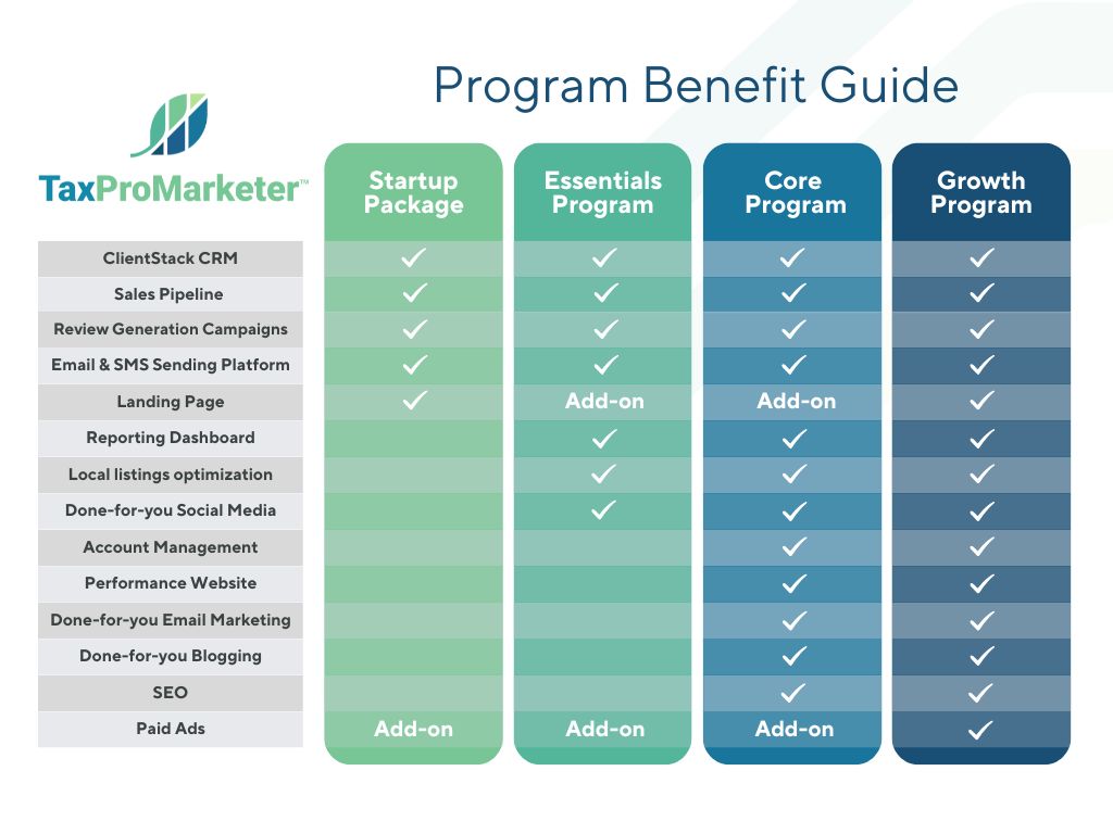 This is a good and important question when evaluating the role that marketing can play in growing your tax and accounting practice. Use this guide to see how our programs can fit your goals and budget.